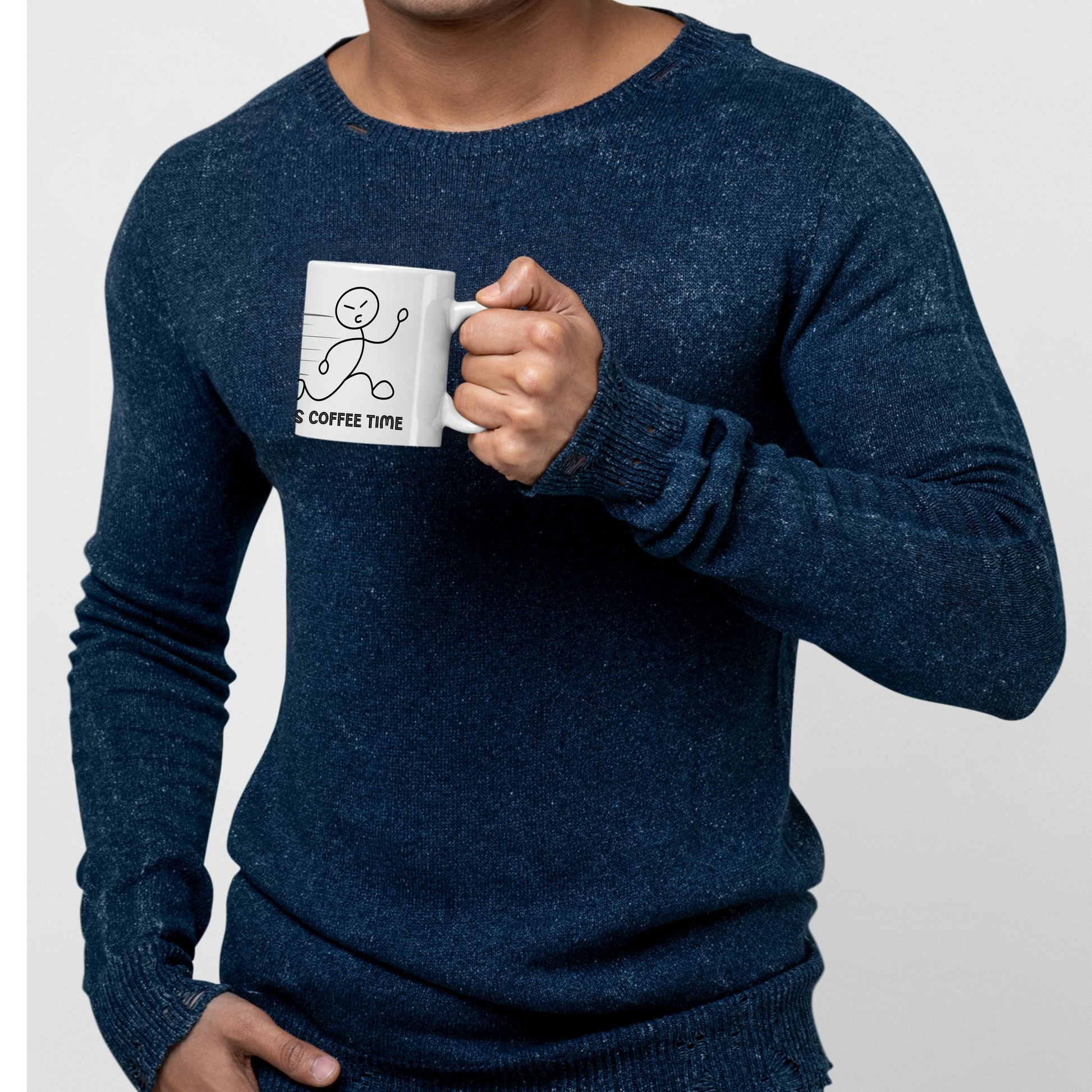 Minimalist funny coffee mug featuring a running figure and the phrase “It’s Coffee Time.” Perfect for coffee lovers and office humor fans. Dishwasher and microwave safe.